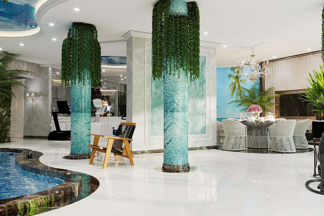 Ümumi dizayn hovuzun formasını, ölçüsünü və ətrafını tamamlamalıdır İşıqlandırma, təhlükəsizlik və atmosfer üçün təbii və süni işıqlandırma da daxil olmaqla xüsusi önəm daşıyır. Rəng sxemi sakitləşdirici və təravətləndirici olmalı və materiallar su və xlora davamlı olmalıdır. Plitələr, üzlüklər və döşəmə seçimləri sürüşməyə davamlı və dayanıqlı olmalıdır.